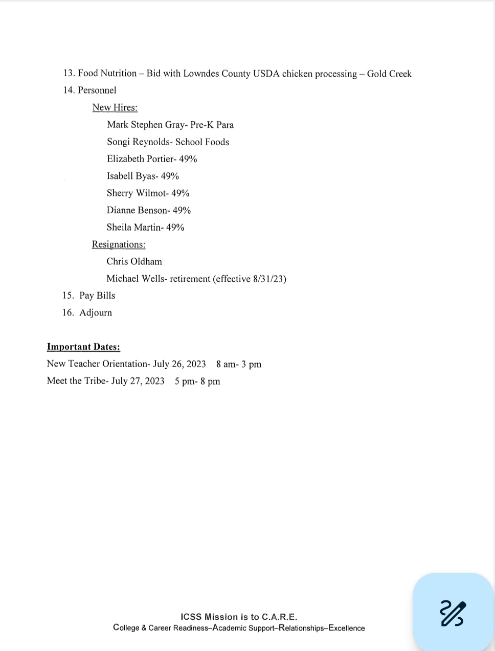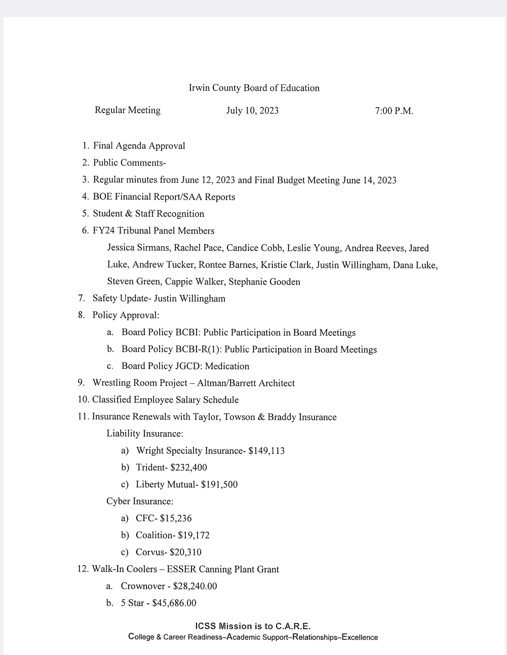 Irwin County Board of Education's July MeetingIrwin County Board of Education's July Meeting Agenda
