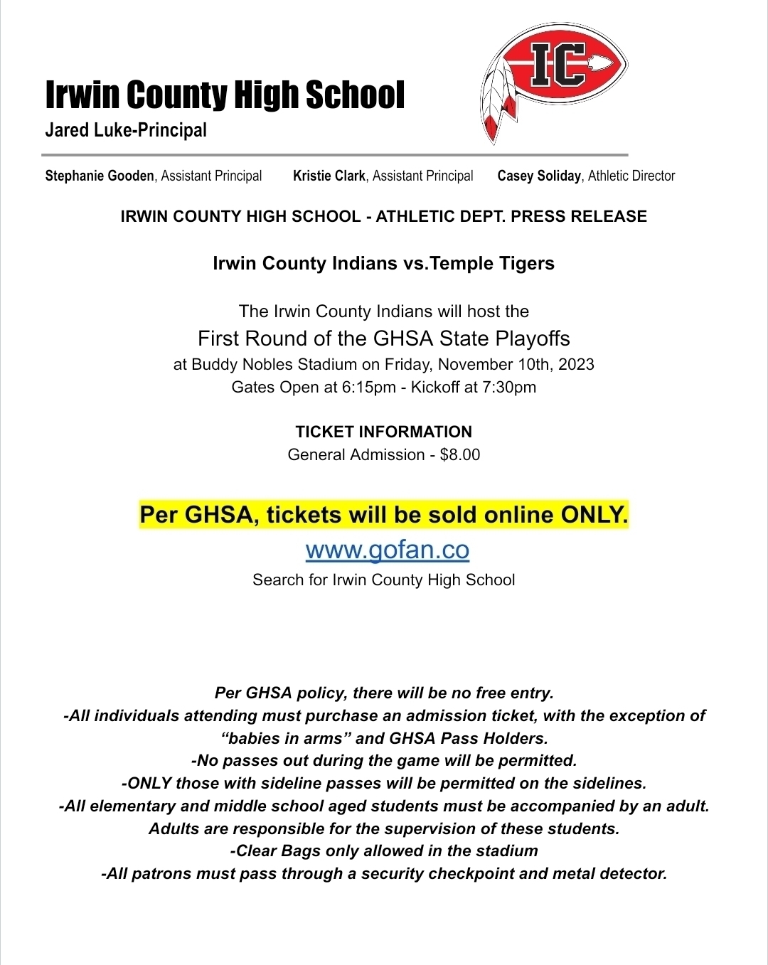 Irwin Hosts First Round of GHSA State Playoffs Irwin County will host the first round of the GHSA playoffs this Friday! Please see the information in the flyer regarding the GHSA guidelines for attending the game. GO INDIANS!!!
