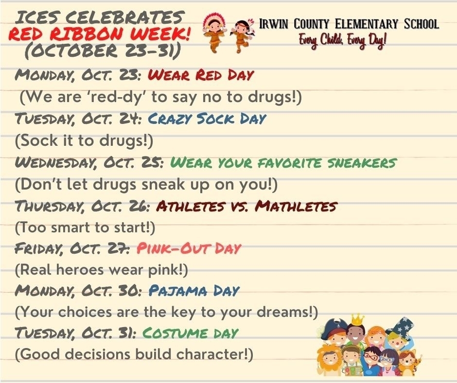 ICES will celebrate Red Ribbon Week starting Monday, 10/23-10/31! Please see the flyer for the activities and dress up days!